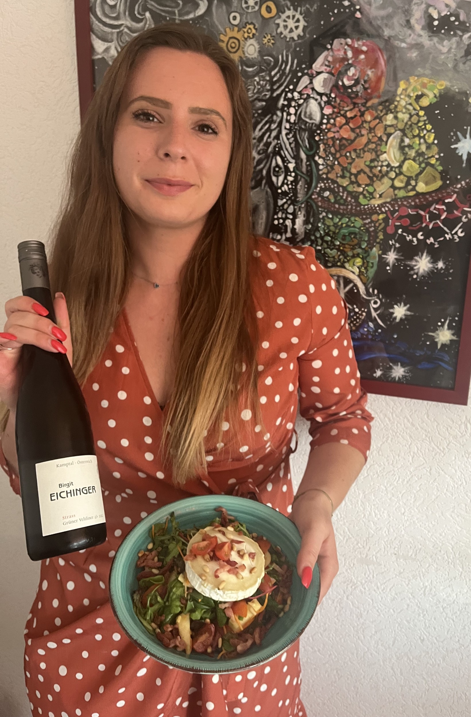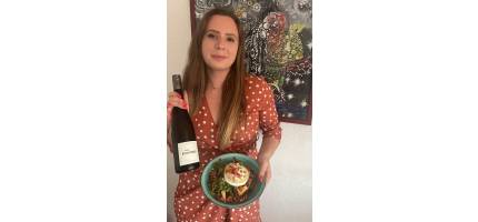 - Doe de sla in een diep bord, laat de geitenkaas erop glijden en garneer met spekjes en pijnboompitten.